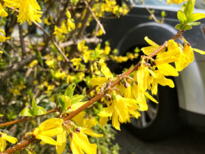 道路沿いの植栽を03月18日撮影。またまたボケ(木瓜)です。花の色が赤や白に混ざっている様子が面白いです。ボケの一品種である「東洋錦」と呼ばれるものなのでしょうか。